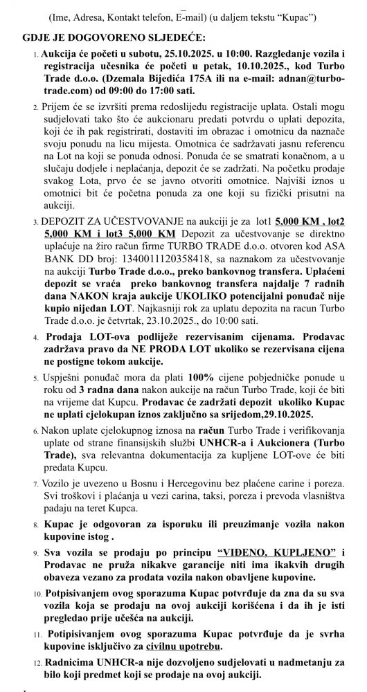 Posebna oprema: • Metalik boja Dodatna oprema: • Treće stop svjetlo • Zračni jastuk suvozača s mogućnošću isključivanja • Zračni jastuci vozača/suvozača i bočni prednji zračni jastuci • Komande za audio i putni računar na volanu • Paket opreme: Nissan Connect sa sistemom Around View Monitor (pogled od 360°) • Automatsko uključivanje svjetala za vožnju • Vanjska ogledala električno podesiva i grijana • Putni računar • Pomoć pri kočenju (Nissan Brake Assist) • Tekna paket pomoći vozaču • Sistem pomoći: aktivna kontrola udobnosti vožnje (kontrola ovjesa) • Sistem pomoći: aktivna motorna kočnica • Sistem pomoći: pomoć pri kretanju uzbrdo • Sistem pomoći: kontrola kočenja u krivinama (aktivna kontrola trake) • Sistem pomoći: asistent u saobraćajnoj gužvi sa funkcijom Stop & Go • Električni podizači prozora naprijed i nazad • Bluetooth hands-free sistem • Laminirano (sigurnosno) vjetrobransko staklo • Zatezači sigurnosnih pojaseva • Grijano zadnje staklo • Unutrašnje ogledalo sa automatskim zatamnjenjem • ISOFIX priključci za dječija sjedišta • Karoserija: 5 vrata • Dječija sigurnosna blokada • Dvozonska automatska klima • Paket udobnosti • Udobna prednja sjedišta (lijevo i desno) • Sistem zračnih jastuka za glavu • Podesivi nasloni za glavu naprijed • Volan podesiv po visini i dubini • Svjetlo za čitanje naprijed • Zadnji naslon za ruke sa držačem za čaše • Stražnje magleno svjetlo • Električna parkirna kočnica • Međuosovinski razmak: 2706 mm • Set za popravku gume • Pomična zadnja klupa • Ekološki standard: Euro 6 • Ručica mjenjača obložena kožom • Pokazivač tačke promjene brzine • Hromirane bočne zaštitne lajsne • Vozačevo sjedište podesivo po visini • Konfiguracija sjedišta: 5 sjedala • Sjenila sa ogledalima i osvjetljenjem • Start/Stop sistem • 12V utičnica u središnjoj konzoli • Vanjske kvake hromirane • USB priključak • Zatamnjena zadnja stakla • Stakla sa zaštitom od topline i UV zraka 1. Aukcija će početi u subotu, 25.10.2025. u 10:00. Razgledanje vozila i registracija učesnika će početi u petak, 10.10.2025., kod Turbo Trade d.o.o. (Dzemala Bijedića 175A ili na e-mail: adnan@turbo-trade.com) od 09:00 do 17:00 sati. 2. Prijem će se izvršiti prema redoslijedu registracije uplata. Ostali mogu sudjelovati tako što će aukcionaru predati potvrdu o uplati depozita, koji će ih pak registrirati, dostaviti im obrazac i omotnicu da naznače svoju ponudu na licu mijesta. Omotnica će sadržavati jasnu referencu na Lot na koji se ponuda odnosi. Ponuda će se smatrati konačnom, a u slučaju dodjele i neplaćanja, depozit će se zadržati. Na početku prodaje svakog Lota, prvo će se javno otvoriti omotnice. Najviši iznos u omotnici bit će početna ponuda za one koji su fizički prisutni na aukciji. 3. DEPOZIT ZA UČESTVOVANJE na aukciji je za lot1 5,000 KM , lot2 5,000 KM i lot3 5,000 KM Depozit za učestvovanje se direktno uplaćuje na žiro račun firme TURBO TRADE d.o.o. otvoren kod ASA BANK DD broj: 1340011120358418, sa naznakom za učestvovanje na aukciji Turbo Trade d.o.o., preko bankovnog transfera. Uplaćeni depozit se vraća preko bankovnog transfera najdalje 7 radnih dana NAKON kraja aukcije UKOLIKO potencijalni ponuđač nije kupio nijedan LOT. Najkasniji rok za uplatu depozita na racun Turbo Trade d.o.o. je četvrtak, 23.10.2025., do 10:00 sati. 4. Prodaja LOT-ova podliježe rezervisanim cijenama. Prodavac zadržava pravo da NE PRODA LOT ukoliko se rezervisana cijena ne postigne tokom aukcije. 5. Uspješni ponuđač mora da plati 100% cijene pobjedničke ponude u roku od 3 radna dana nakon aukcije na račun Turbo Trade, koji će biti na vrijeme dat Kupcu. Prodavac će zadržati depozit ukoliko Kupac ne uplati cjelokupan iznos zaključno sa srijedom,29.10.2025. 6. Nakon uplate cjelokupnog iznosa na račun Turbo Trade i verifikovanja uplate od strane finansijskih službi UNHCR-a i Aukcionera (Turbo Trade), sva relevantna dokumentacija za kupljene LOT-ove će biti predata Kupcu. 7. Vozilo je uvezeno u Bosnu i Hercegovinu bez plaćene carine i poreza. Svi troškovi i plaćanja u vezi carina, taksi, poreza i prevoda vlasništva padaju na teret Kupca. 8. Kupac je odgovoran za isporuku ili preuzimanje vozila nakon kupovine istog . 9. Sva vozila se prodaju po principu “VIĐENO, KUPLJENO” i Prodavac ne pruža nikakve garancije niti ima ikakvih drugih obaveza vezano za prodata vozila nakon obavljene kupovine. 10. Potpisivanjem ovog sporazuma Kupac potvrđuje da zna da su sva vozila koja se prodaju na ovoj aukciji korišćena i da ih je isti pregledao prije učešća na aukciji. 11. Potipisivanjem ovog sporazuma Kupac potvrđuje da je svrha kupovine isključivo za civilnu upotrebu. 12. Radnicima UNHCR-a nije dozvoljeno sudjelovati u nadmetanju za bilo koji predmet koji se prodaje na ovoj aukciji.